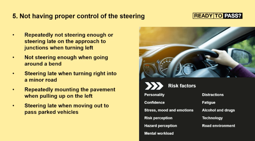 Maintaining control of the steering wheel is essential for safe driving as most steering faults will ultimately result in poor road position which will inevitably result in a potentially dangerous outcome with other traffic or road users. Let’s take a look at what you might do which may be counted as a steering fault.